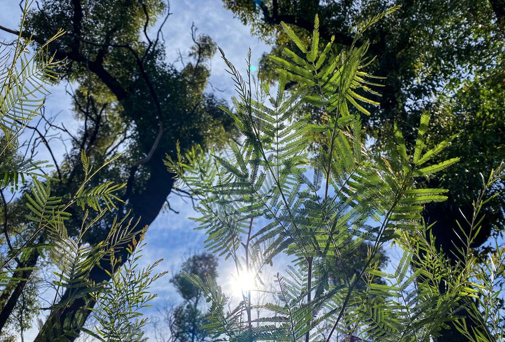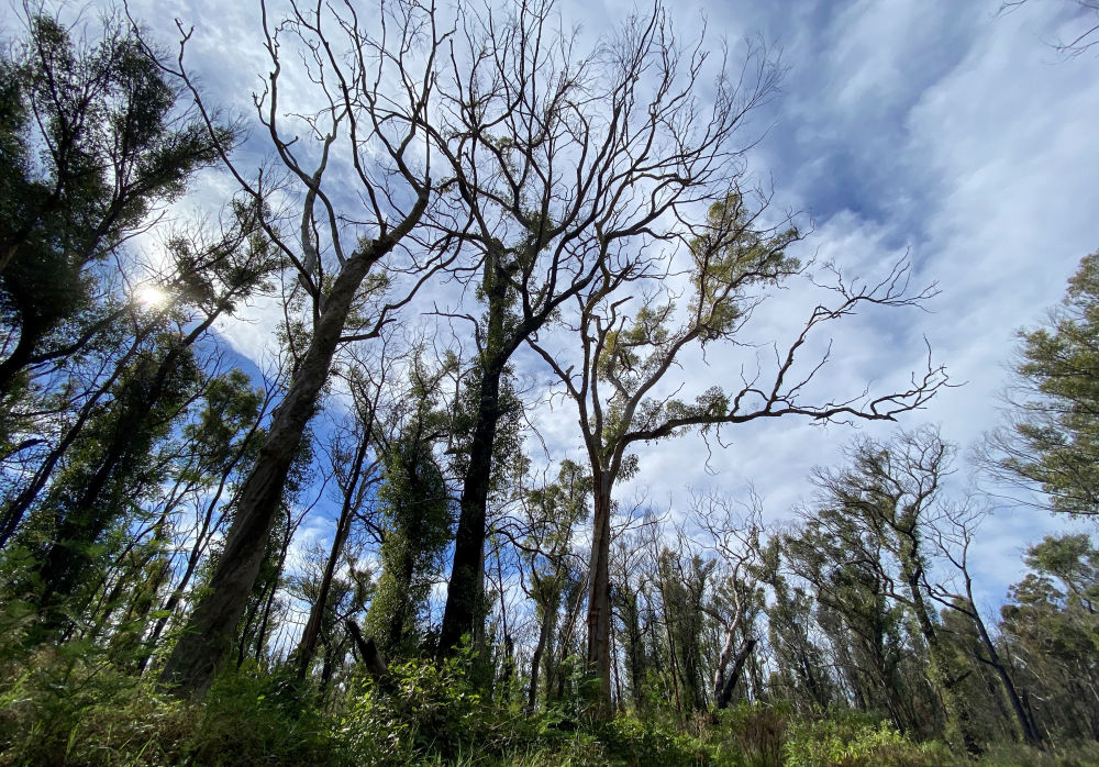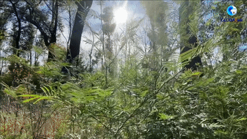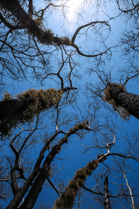 很多被烧得黝黑的树木上已经长满新的枝叶