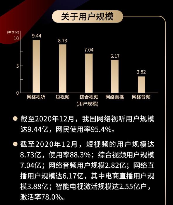 而在第九届中国网络视听大会发布的《2021中国网络视听发展研究报告》则给出了具体用户规模:截至2020年12月,短视频用户规模达8.73亿,使用率88.3%。