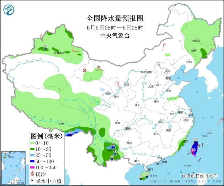 另外,受冷空气影响,5日至7日,新疆北部、内蒙古中西部、甘肃等地自西向东将有4~8℃降温,局地降温可达10℃,并伴有 4~6级风,新疆北部山口风力可达8级左右;新疆南疆盆地和东部、内蒙古中西部、甘肃河西、宁夏北部等地的部分地区有扬沙或浮尘。5日,新疆北部部分地区将有小到中雨,局地大雨。
