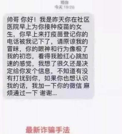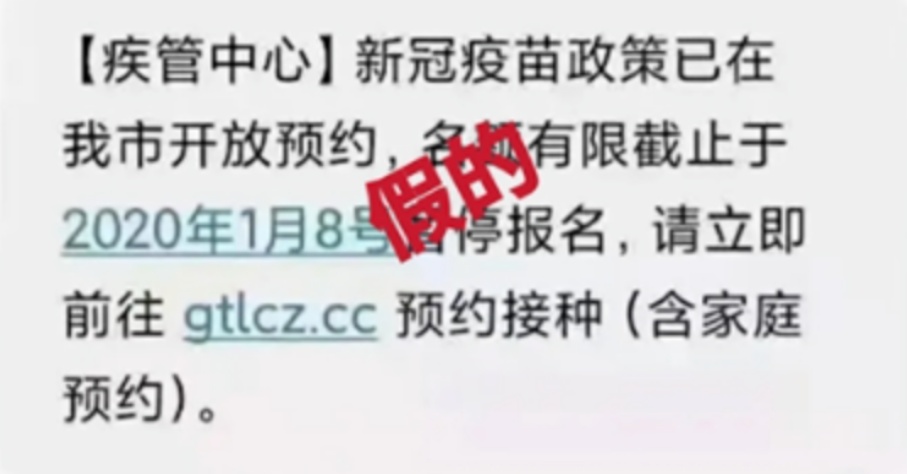 近期有人冒充疾控中心散发“交费接种新冠疫苗”的短信,其中包含引诱性链接,切勿输入个人信息、银行卡号、密码及手机验证码。