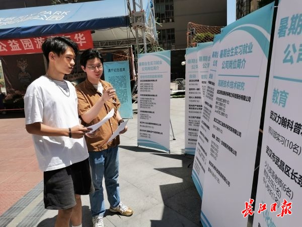 广场上,暑期台生实业就业公司岗位宣传海报一字排开,吸引台湾学生驻足观看,认真记录,流露出浓厚的兴趣。海报上共展示了金融、建筑及家装工程、高新技术及技术研究、教育、文化娱乐等多个方面的相关职位。微信扫一扫二维码即可了解职位详细信息。