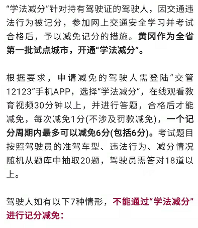 6月4日,黄冈交警宣布开通“学法减分”系统,持有黄冈市公安局交通警察支队核发的驾驶证或交管12123注册地为黄冈的驾驶人,不区分驾驶证准驾类型,也不区分是否为营运车辆驾驶人,均可参与。