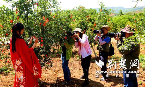 荆楚网(湖北日报网)讯(通讯员闫瑞雨、涂大明、许光泽)花红似火,人潮如涌,6月6日,丹江口市江北石鼓镇花果山万亩柑橘、石榴采摘基地游人如织,市文联助力乡村振兴摄影小分队带领汉服模特30余人前来采风拍片,通过短视频APP、交友群、朋友圈、自媒体等平台为南水北调中线水源区果农代言,推介旅游资源和特色产业,为乡村振兴摇旗。