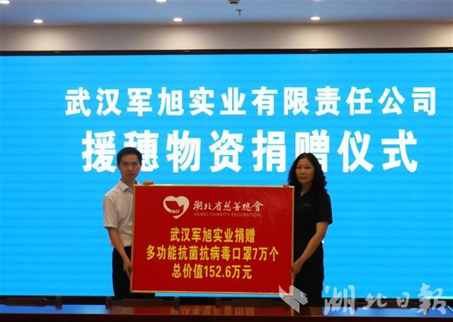 湖北日报讯 (记者包东喜、通讯员胡兵)6月8日,武汉军旭实业有限公司援穗物资捐赠仪式在湖北省慈善总会举行,武汉军旭实业有限公司定向向广州市慈善会、广东省行业协会联合会捐赠70000个多功能抗菌抗病毒口罩,价值152.6万元,用于支持广州市新冠肺炎疫情防控工作。