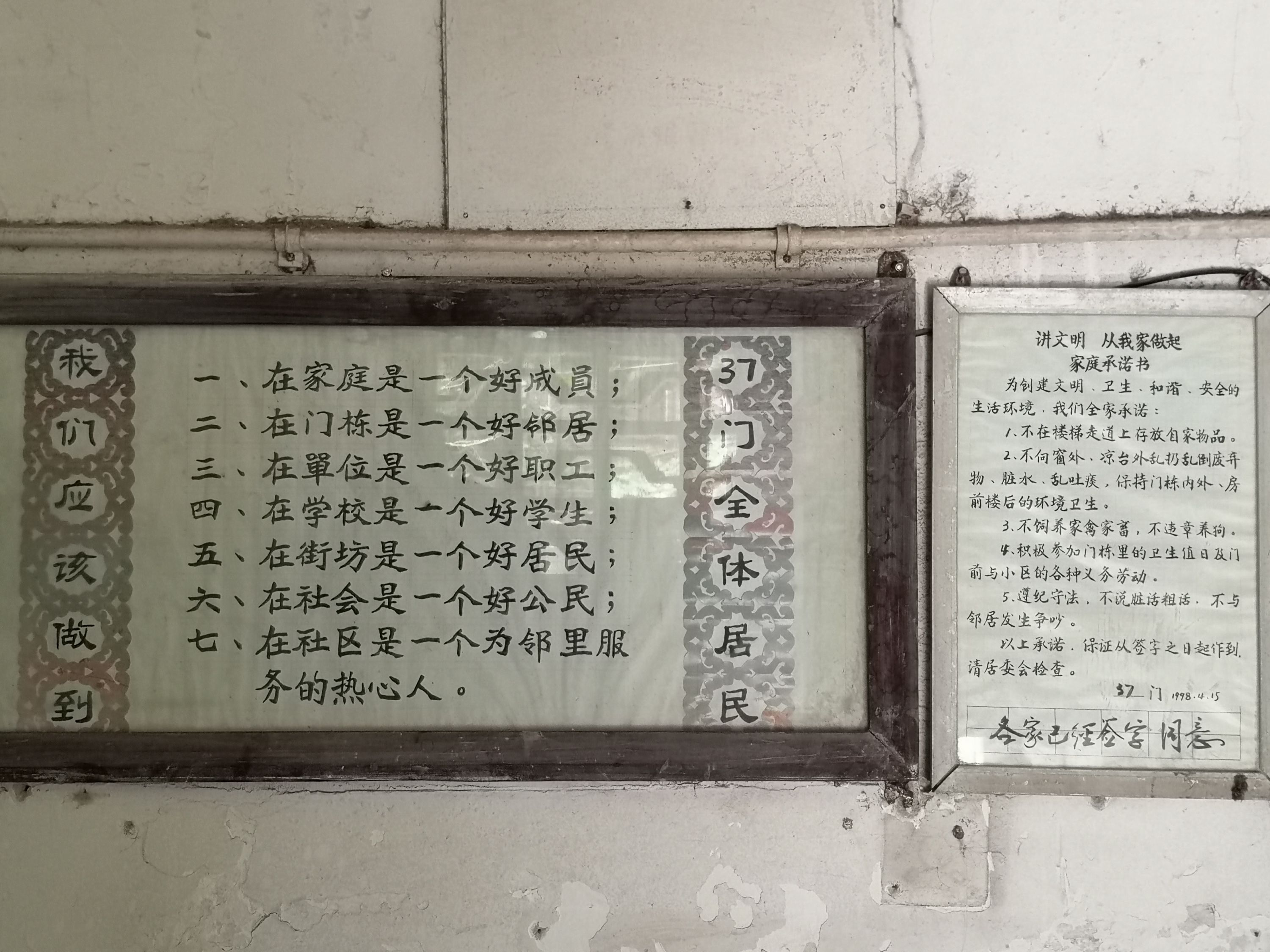 两块挂在37门1楼墙上的居民文明公约牌已有23年的历史。 长江日报记者覃柳玮 摄