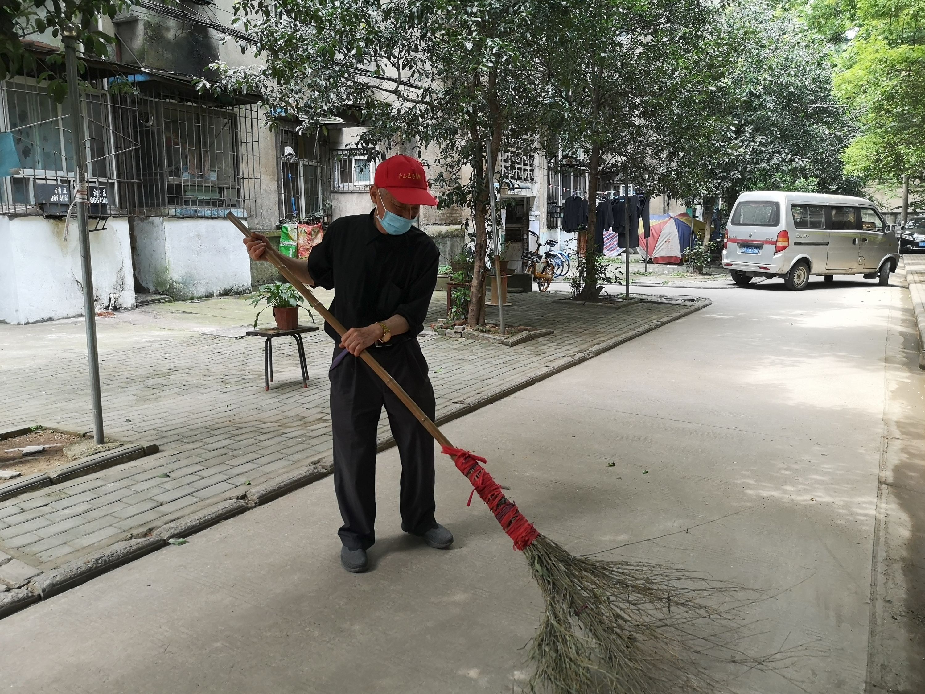 75岁的谢累保于2007年搬来37门。从那时起,他便开始扫楼道以及楼栋前后的小路,一直坚持到现在。谢累保家门前放着两把扫帚,一把小扫帚用来扫楼道,大的竹扫帚用来扫小路。小路长约100米、宽3米,从37门到41门;楼栋前后共200多米,每天扫完要1个多小时。