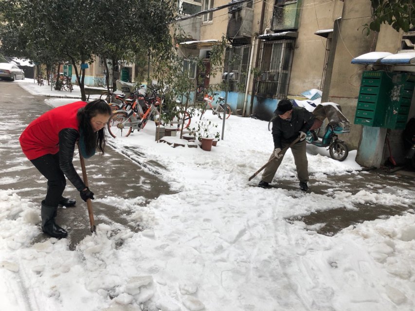 谢累保(右)正在和居民一起扫雪。 社区供图