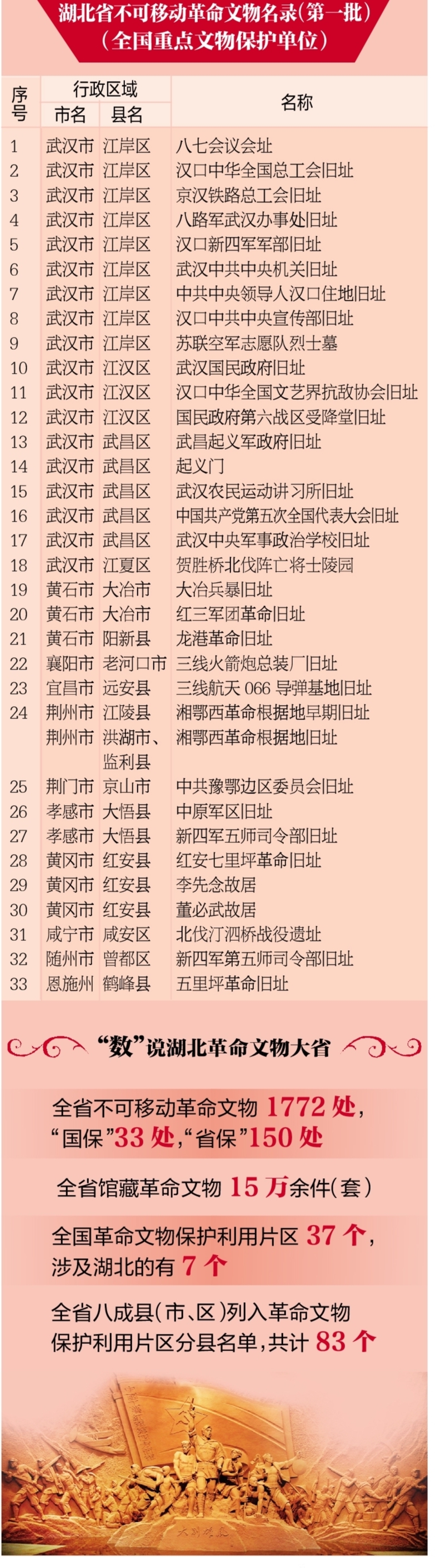3月29日,按照国家文物局有关要求和标准,结合湖北省革命文物资源状况,我省核定公布了《湖北省革命文物名录(第一批)》。首批公布不可移动革命文物1018处、可移动革命文物2810件(套)。其中,不可移动革命文物包括全国重点文物保护单位33处,省级文物保护单位150处,市县级文物保护单位835处。