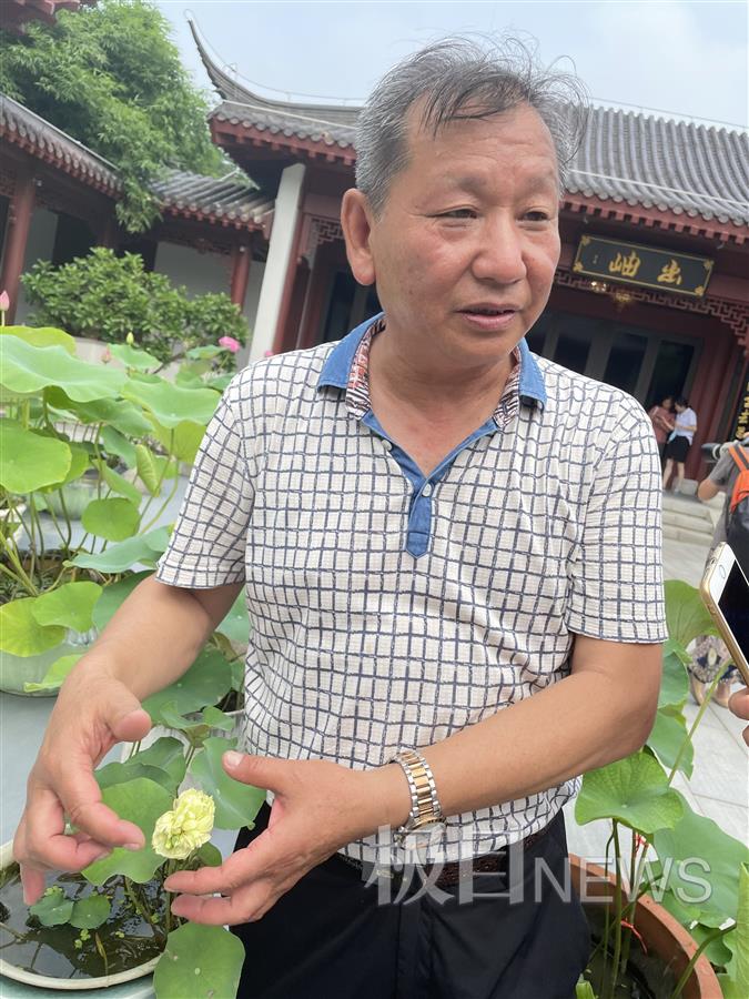 一缸缸荷花,热夏中盛情绽放,凝结了花匠们的心血。“荷花夏日开,这个时间就决定了必须顶着日头工作,浇水、施肥、摘叶,一天晒几个小时,有多辛苦,只有自己知道。”杨雄的脸和胳膊被晒得黝黑。