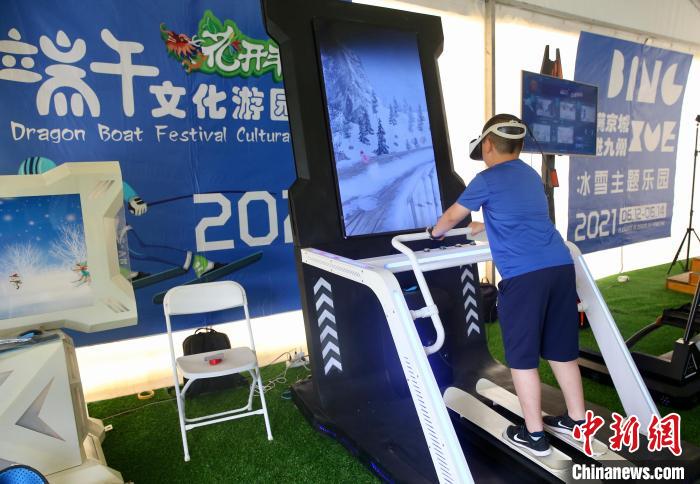 冰雪主题乐园内,男孩体验VR滑雪。 易海菲 摄