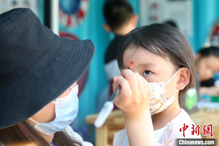 端午民俗体验区,工作人员为小女孩用雄黄画额。 易海菲 摄