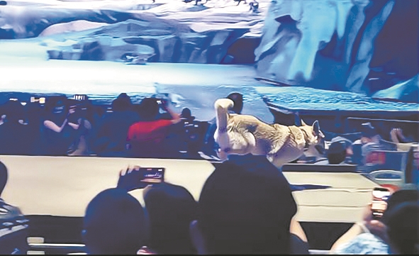 网友提供的视频显示,在一场室内演出的舞台上,随着节奏紧张的音乐响起,狼群突然现身并冲向台下。数十头灰狼一拥而下,场下观众席内惊叫声连连,狼群并没有冲向观众席,而是跑过场馆内提前设计好的观众席过道,它们环绕过道后又跑向舞台。极目新闻记者注意到,狼的数量虽多,但途经路线并没有波及观众,演出现场秩序井然。