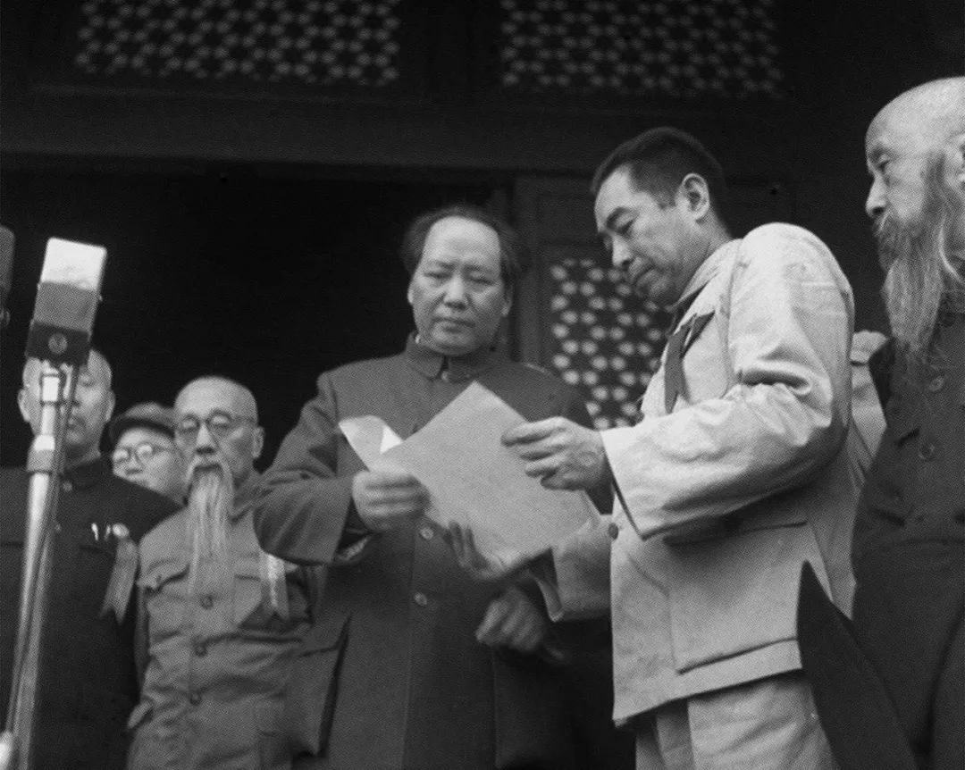 1949年10月1日,天安门广场上隆重举行开国大典,周恩来和毛泽东等在天安门城楼上。