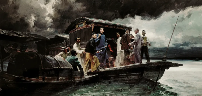 《启航——中共一大会议》1921年7月23日,中国共产党第一次全国代表大会在上海召开,最后一天转移到浙江嘉兴南湖举行。(油画 何红舟 黄发祥)