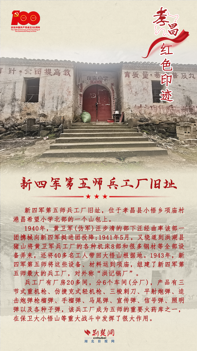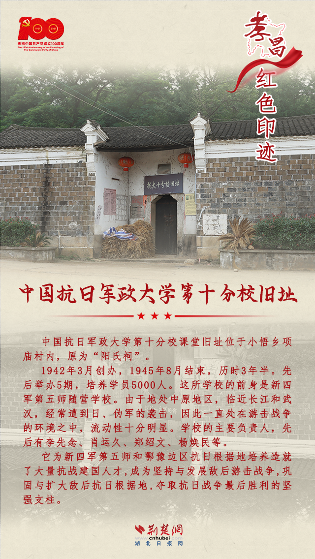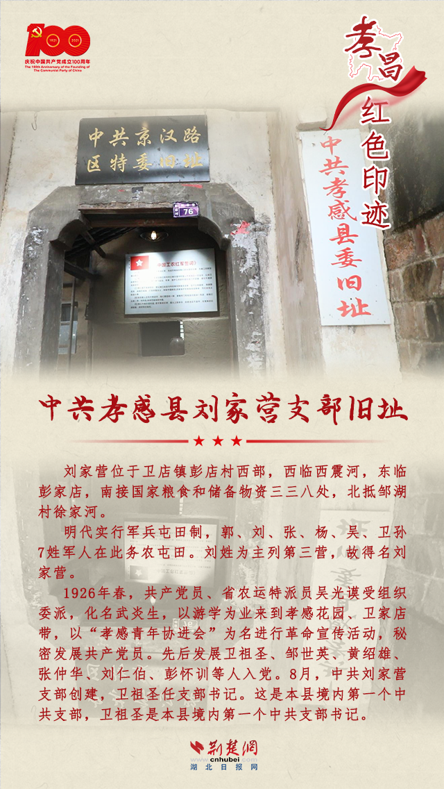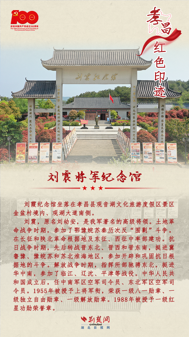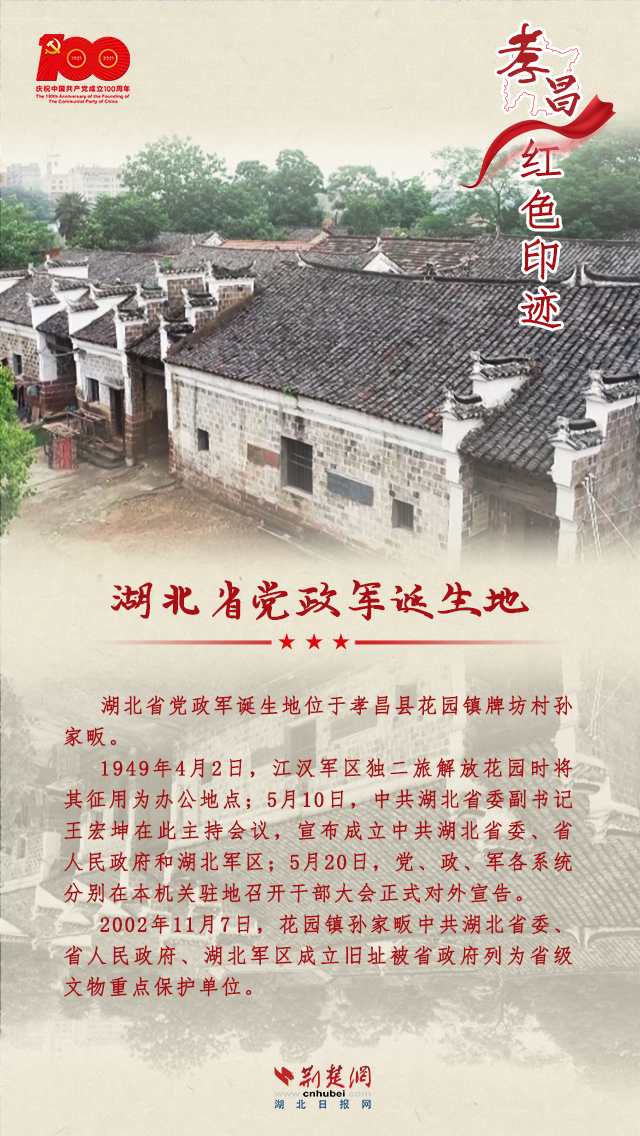 孝昌是一片红色的热土,从1921年中国共产党诞生至新中国成立,全县有近8万人民群众参军参战,近万名英雄儿女壮烈牺牲;全国解放后,有80多位烈士英勇献身。孝昌县现有革命旧址33处,省级文物保护单位2处,革命文物145件。