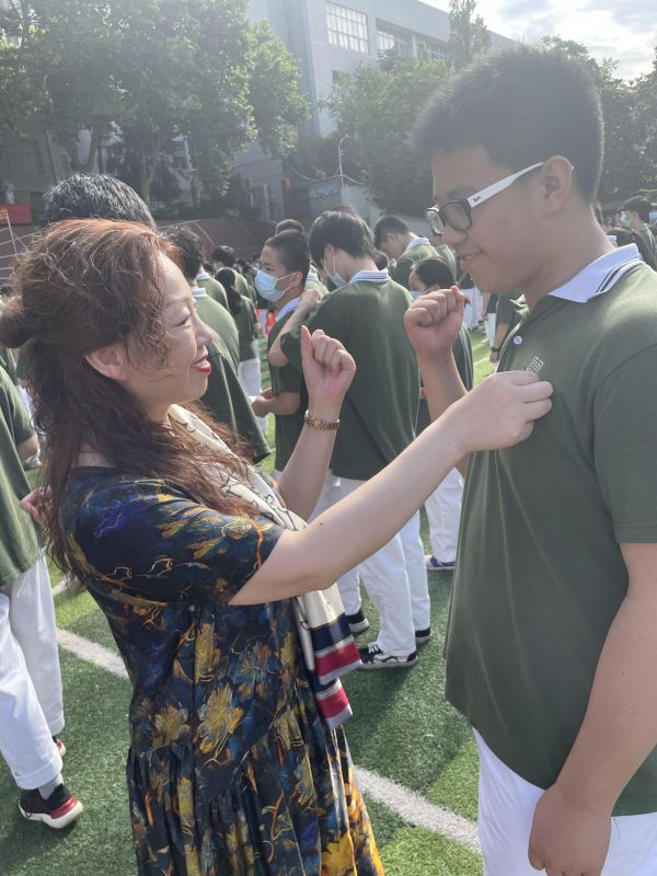 班主任为学生戴上订制版校徽。学校供图