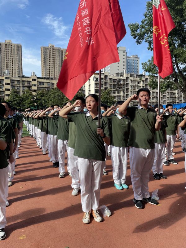 长江日报6月15日讯 为了培养学生家国情怀,增强学生的凝聚力及归属感,让九年级学子感受到母校的温情,6月15日,武汉市翠微中学举行2021届毕业生在母校参加的最后一次升旗仪式,活动中班主任为每一名毕业生戴上订制版校徽,并送上祝福与期望。