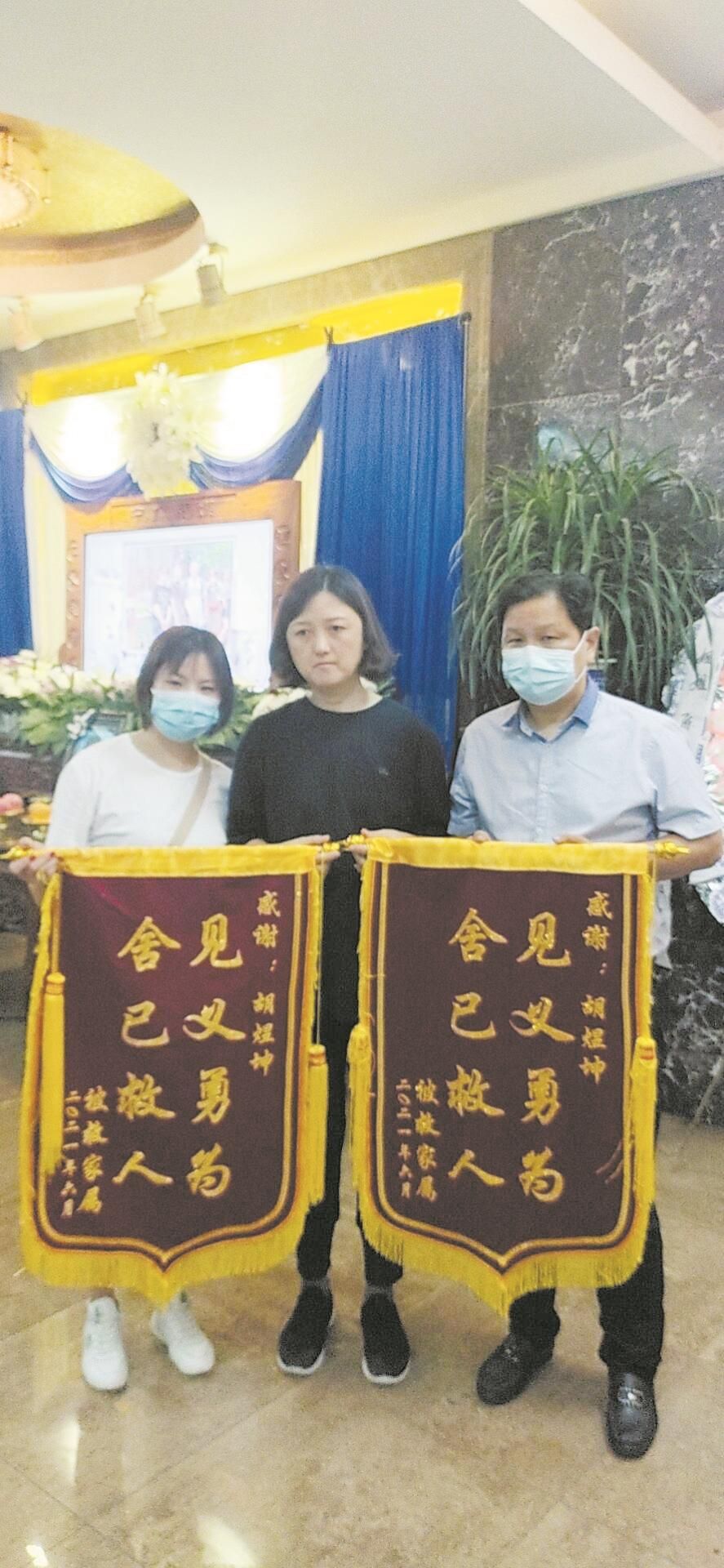 晚8时许,两名获救小学生的家属,送来锦旗和感谢信,感谢奋不顾身英勇救人的胡煜坤,表达他们的痛惜和哀思。一位家属情绪激动,抹着泪说:“他真的是英雄……”