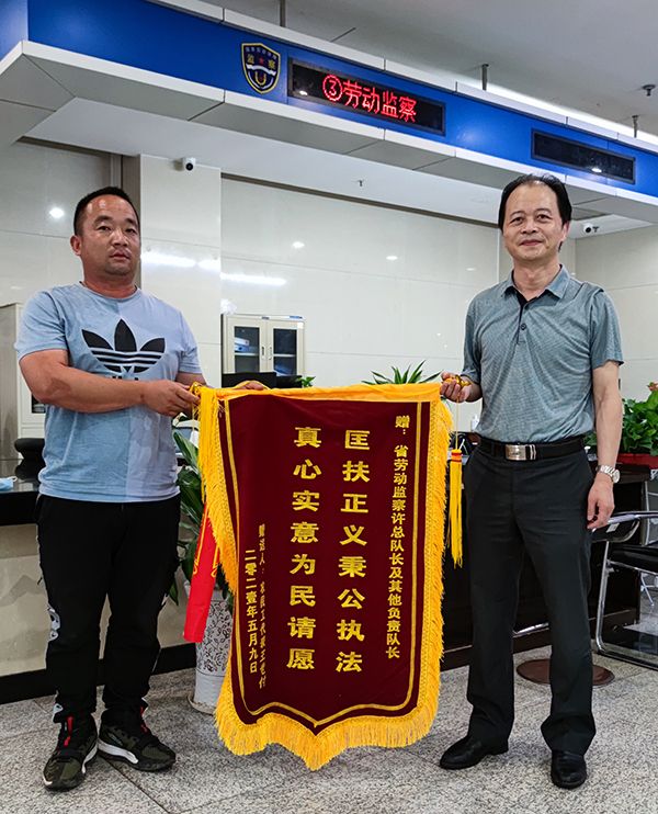 荆楚网(湖北日报网)讯(记者徐蕾 通讯员 陈多红)5月31日下午,湖北省人社厅劳动保障监察执法窗口前,一位手握锦旗的农民工在耐心等待、默默期盼!工作人员跟他解释道:“领导们正在参加全省工作视频会议,时间会比较长,可以代为转送锦旗和表达心意,以免耽误您的时间,”但是农民工王世付执拗地说:“必须等,这是我父亲亲口叮嘱的,我得将这面锦旗亲手交到许波总队长手中,感谢他们为我们要到了十几万的血汗钱,父亲虽然不能来,但是这份情不能少。”两个小时的默默等待,当双手紧握在一起的时候,是劳动保障监察全体党员的心与每一位劳动者紧贴在一起的时候;是劳动保障监察处(局)、总队党支部学史力行的最直接体现;是劳动保障监察处(局)、总队党支部将保障劳动者合法权益深根于思想、落实到行动上的最生动诠释。