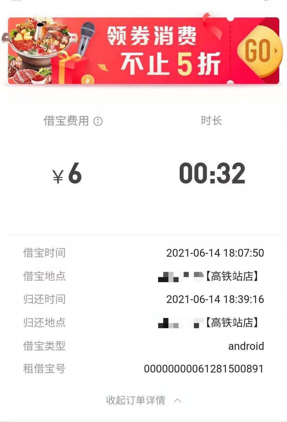 6月15日,来自江苏的孙女士告诉澎湃新闻,14日端午节当天,她在安徽阜阳高铁站内放置的来电共享充电桩借了一个共享充电宝。32分钟后,她将充电宝归还,发现最终扣了6元钱。