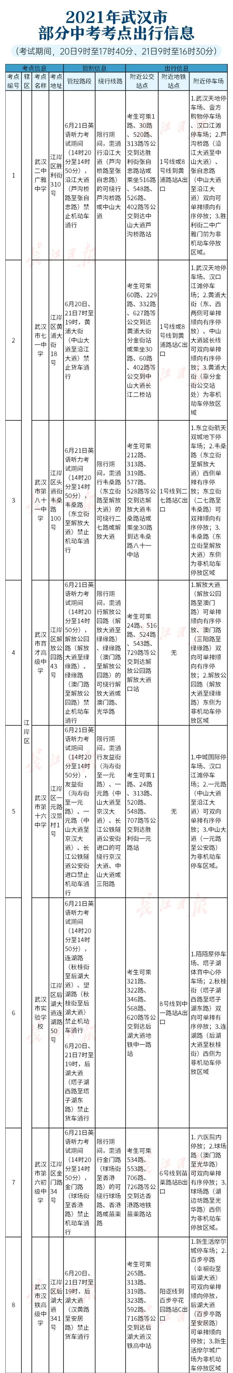 今年全市有80个中考考点,考点较集中的区域在江岸、江汉、硚口、汉阳、武昌、青山等区域。由于中考第二天为工作日,送考车流与上班车流叠加,考点周边道路交通压力增大,尤其在永清街、三阳片区、江汉北路、崇仁路、粮道街等部分道路考点分布密集,建议送考车辆提前规划好出行线路。