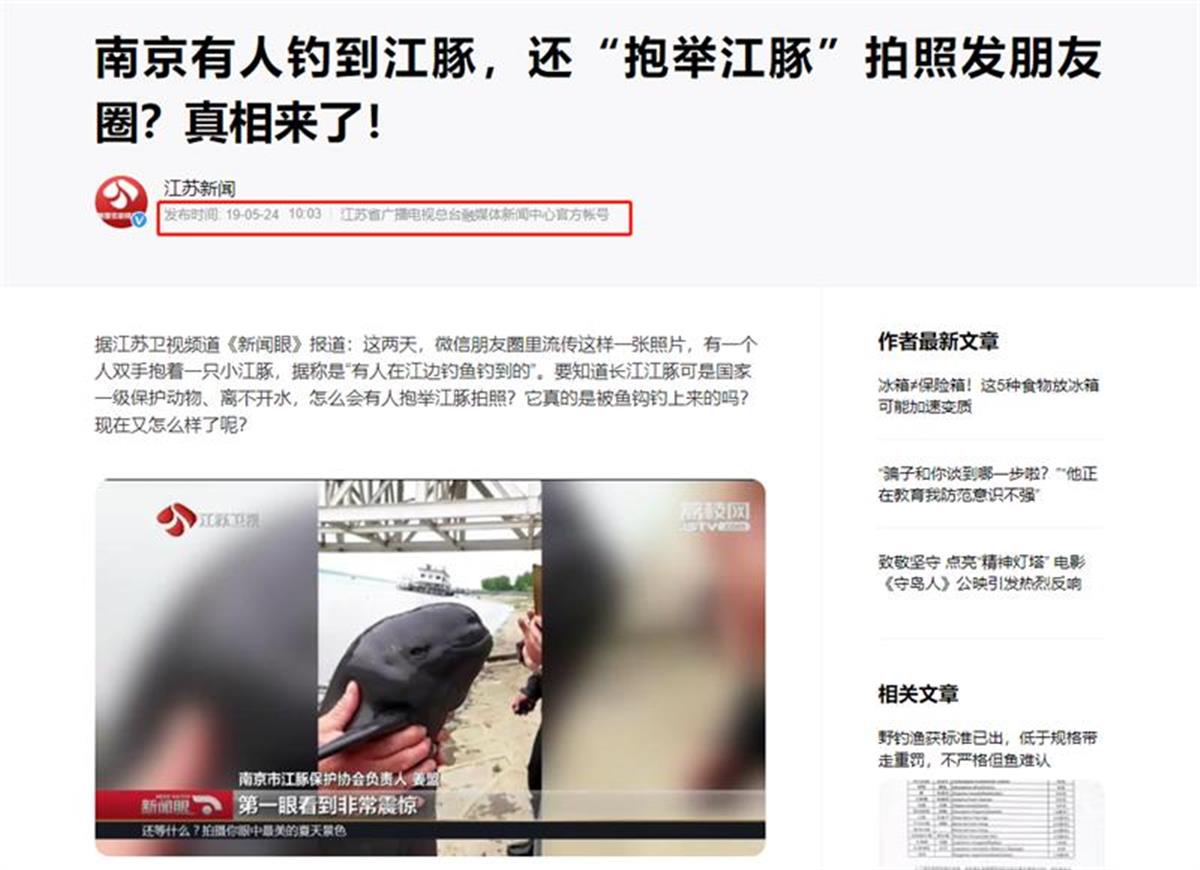 2019年5月24日,江苏卫视频道《新闻眼》还曾报道:微信朋友圈里流传一张“有一个人双手抱着一只小江豚”的照片,据称是“有人在江边钓鱼钓到的”。警方发现,事件发生地在南京五马渡广场附近的江岸,一位钓鱼的老师傅承认称,当时他们发现小江豚可能搁浅了,有个钓友用网兜把它捞上来。老师傅抱起来一看是江豚,又是好好的,于是赶紧把它放回水里。旁边有游客,可能没有见过江豚,于是就拍了一张照片。