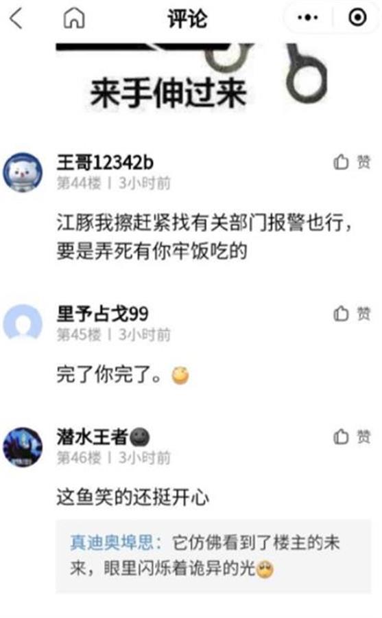 极目新闻记者看到,网传的两张江豚照片,其中一张,江豚躺在江边礁石上,另一张则是江豚被人举起。在贴吧评论区,有网友评论道:“这叫‘牢底坐穿兽’,是江豚。”建议赶紧报警处置。
