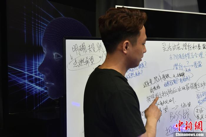 周新宇向记者讲述他对该抗战题材教育类游戏的设想。中新网记者 李骏 摄