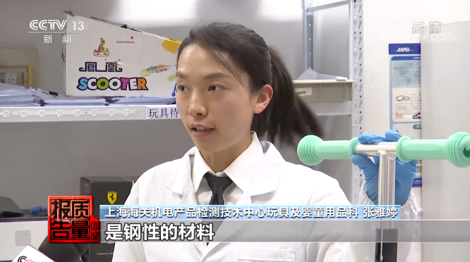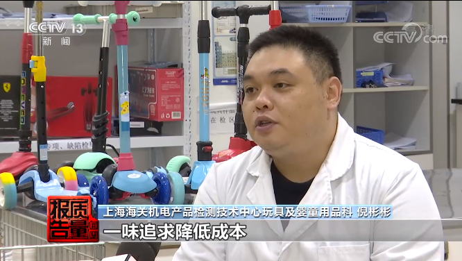 上海海关机电产品检测技术中心玩具及婴童用品科 倪彬彬:玩具滑板车的生产企业在生产过程中,一味追求降低成本,在生产过程中偷工减料,比如说它的那个玩具滑板车车体的那个金属管件,随意就是减少管壁厚度,同样就是降低了玩具滑板车整体的一个强度,会造成那种强度不合格的情况发生。