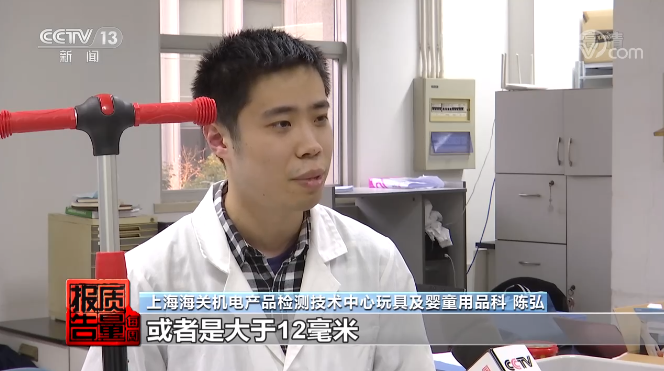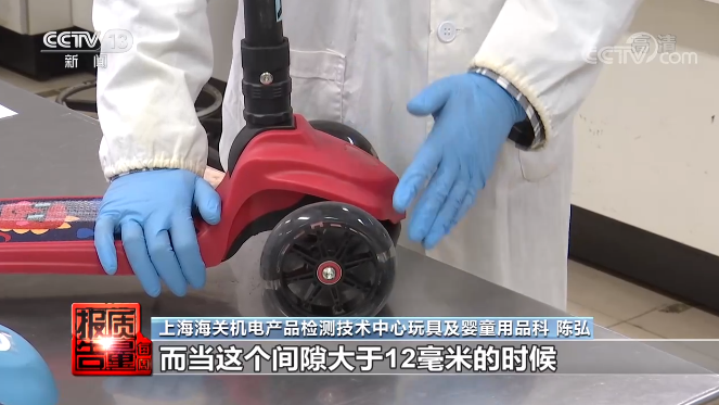 上海海关机电产品检测技术中心玩具及婴童用品科 倪彬彬:玩具滑板车主要存在的问题就是在一个机械物理性能方面有问题,比如说它的钢性材料上的圆孔的直径不符合标准要求,或者在生产过程中有锐边、锐尖、毛刺等情况,或者是在车轮和车体之间的间隙存在夹手指的一个风险。