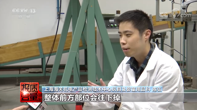 上海海关机电产品检测技术中心玩具及婴童用品科 陈弘:儿童在使用的过程中,有可能把身体压在把手上,导致把手往下压,如果它没锁住的话,整体前方部位会往下掉,儿童整体有可能会造成倾倒,而造成损伤。
