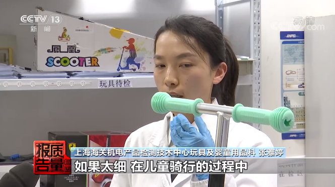 上海海关机电产品检测技术中心玩具及婴童用品科 张雅婷:就是它的那个保护套的末端,它的直径要大于等于40毫米,那也就是说它的这个把手不能太细。如果太细的话,就是在儿童骑行的过程中,如果倾倒的话,也是会有这个突出物的风险。