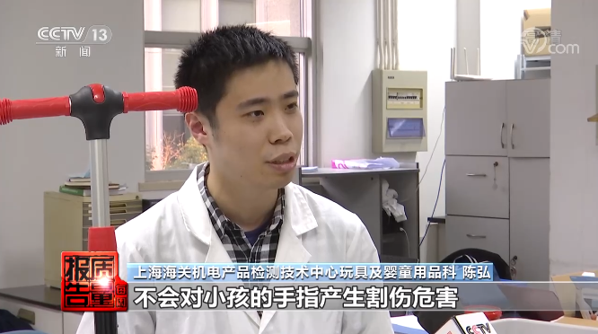 上海海关机电产品检测技术中心玩具及婴童用品科 陈弘:活动部件间隙,它这个部分,车轮是在不断的滚动当中的,小孩子的手指一旦陷入其中将无法拔出来,从而造成相对的挤压的伤害。而且这个挤压伤害会持续下去,因为轮子活动部件是一直在滚动。