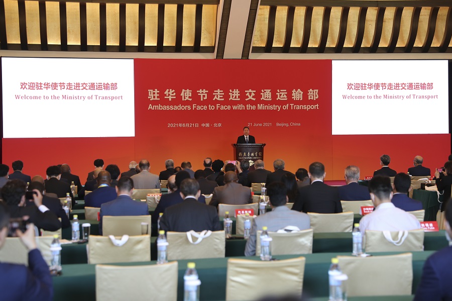 中国日报6月21日北京电(记者 冯永斌)2021年6月21日,交通运输部举办的“驻华使节走进交通”活动在北京举行。此次活动是外交部组织的“驻华使节走进中国部委”系列参访活动的第二站,交通运输部部长李小鹏出席活动,并与130多位驻华使节和国际组织驻华代表就交通运输改革发展进行了深入的互动交流。