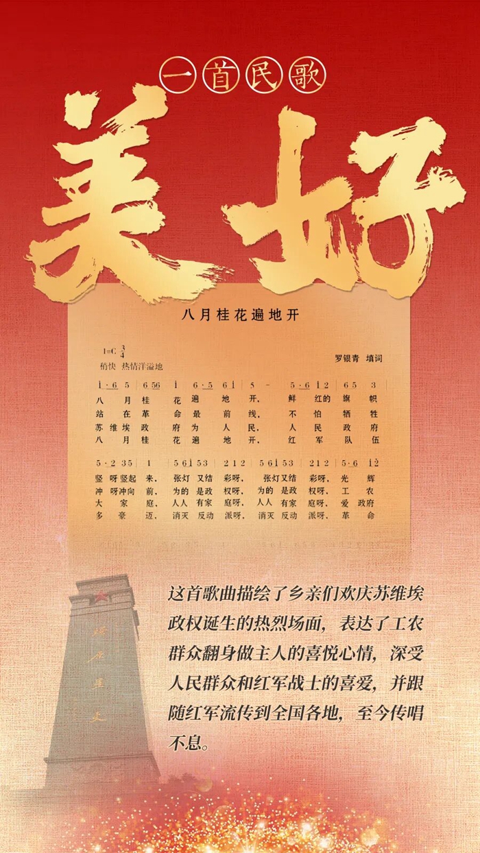 90年多前,喜爱民歌的共产党员、小学教师罗银青用曲调欢快的大别山民歌《八段锦》,填词创作了这首《八月桂花遍地开》歌曲,描绘了乡亲们欢庆苏维埃政权诞生的热烈场面,表达了工农群众翻身做主人的喜悦心情。