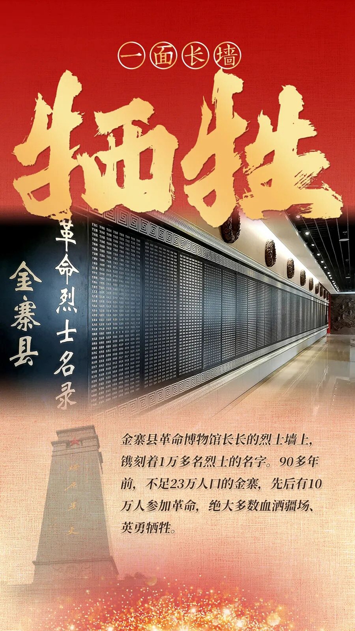 一寸山河一寸血,一抔热土一抔魂。90多年前,不足23万人口的金寨先后有10万人参加革命,绝大多数血洒疆场、英勇牺牲。“最后一把米拿去当军粮,最后一块布拿去做军装,最后一个儿送去上战场”是当时金寨人支援革命的真实写照。“金寨几乎家家都有祖辈或父辈参加革命,包括我家。”80后的金寨县革命博物馆副馆长杨晓璐说。