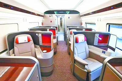 一等座椅增加了可调节头靠、电动腿靠等,将原来设置在座椅扶手上的小桌板改为设置在前排座椅靠背上。