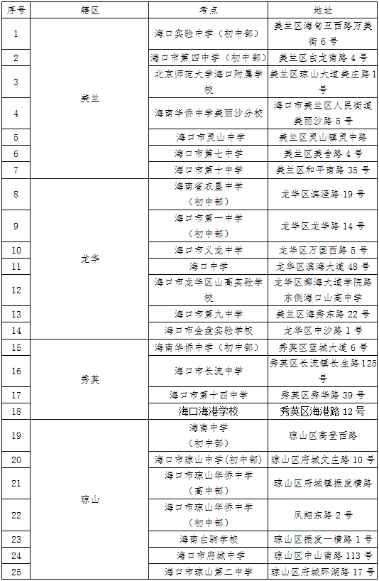 北京师范大学海口附属学校、海口市灵山中学、海口山高高级实验中学、海口市第十四中学、海南华侨中学(初中部)、海口市长流中学所处位置不在海口市货车限行范围内。考试期间,请途经以上六处考点路段的货车驾驶人择道绕行: