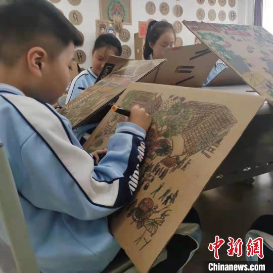 在近一个月的创作时间里,小学生们热情不减。作品中的瓦片、树木、人物等线条,均由美术教师指导。而纸壳泛旧的色彩,也贴合了作品的基调和主题。