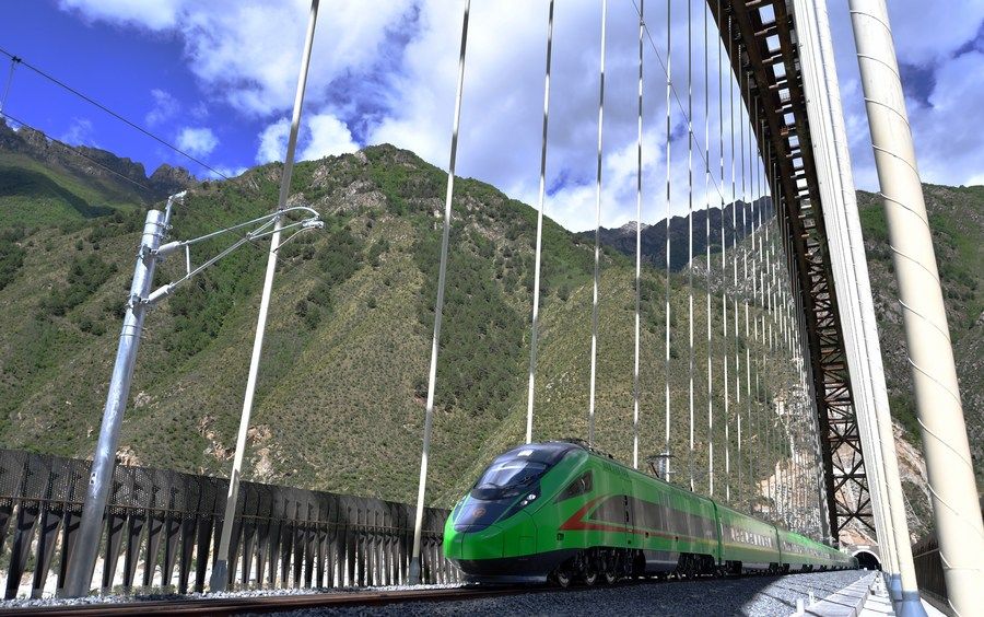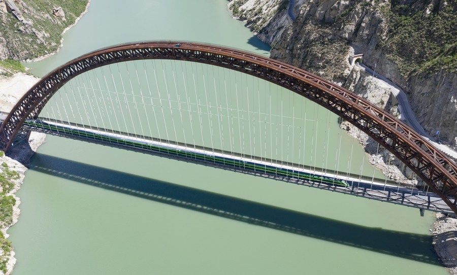 试运行的复兴号列车行驶在藏木特大桥上(6月17日摄)。新华社记者 觉果摄