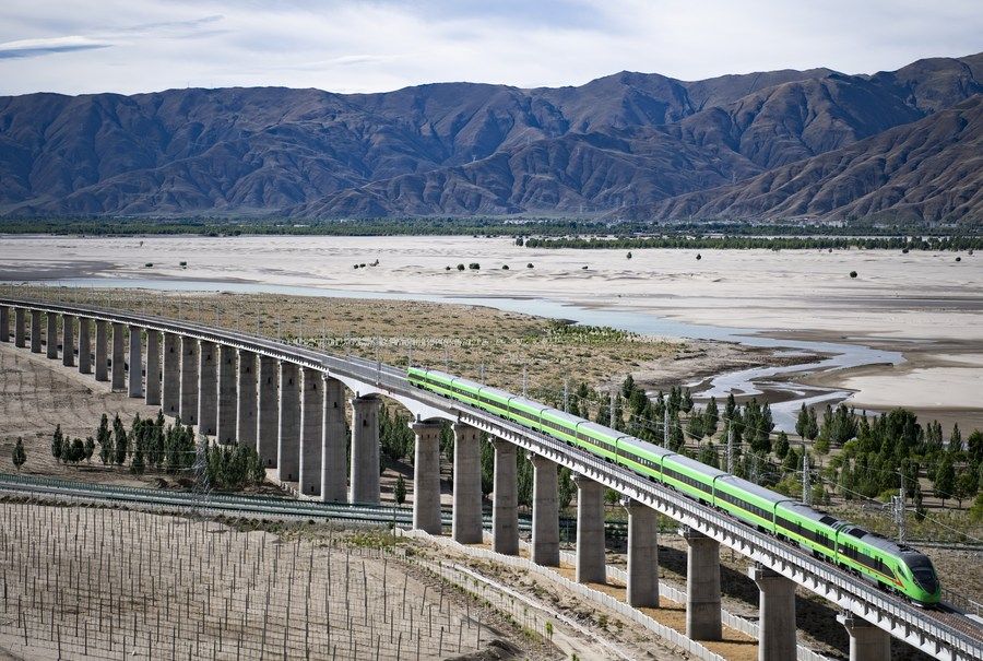 试运行的复兴号列车行驶在雅鲁藏布江畔(6月16日摄)。新华社记者 普布扎西摄