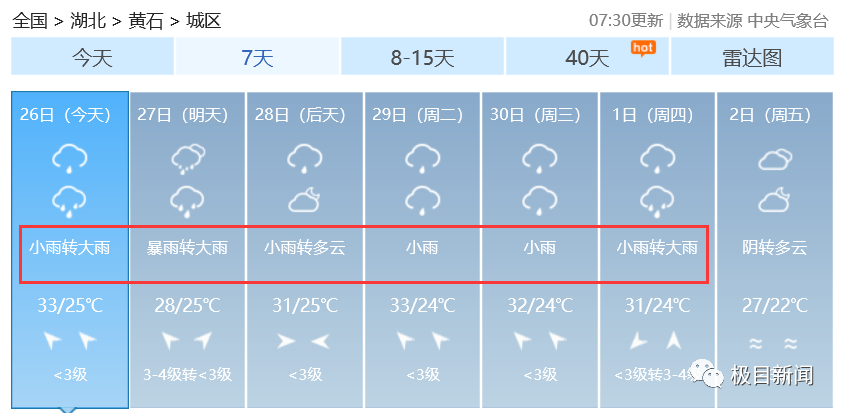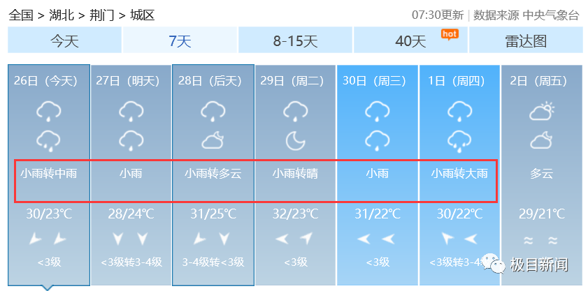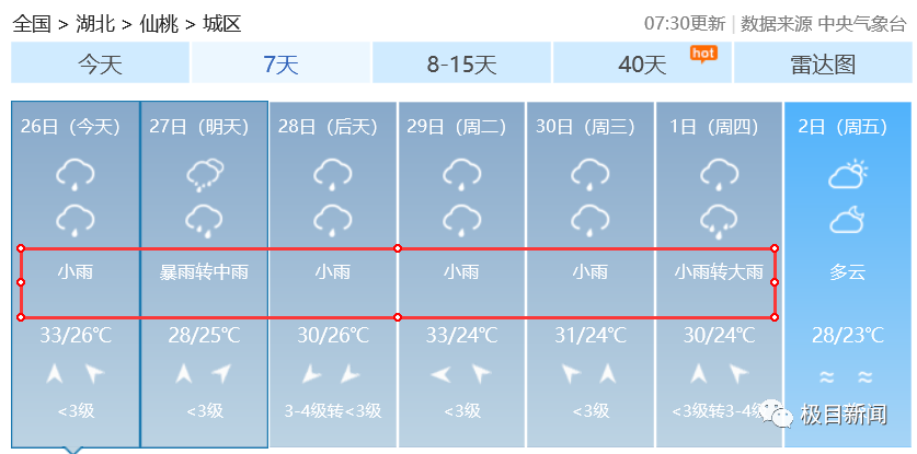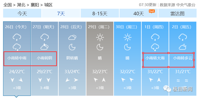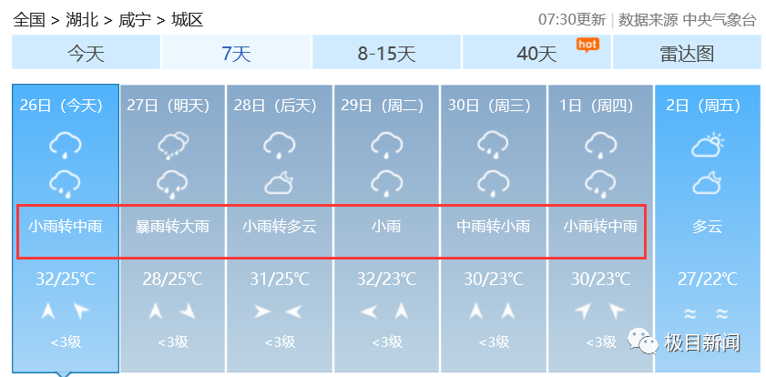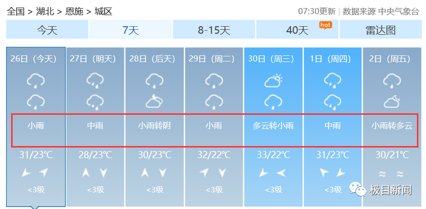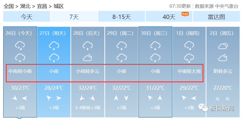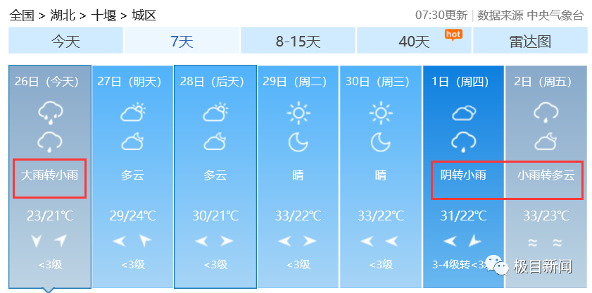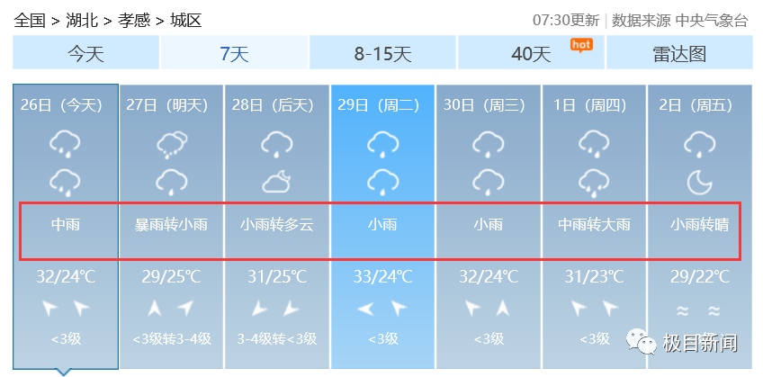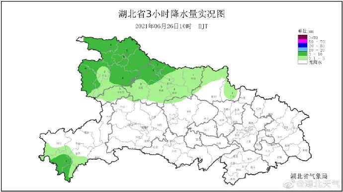 中到大雨局部暴雨在鄂北和鄂西南,其他地区只是午后局部有阵雨。