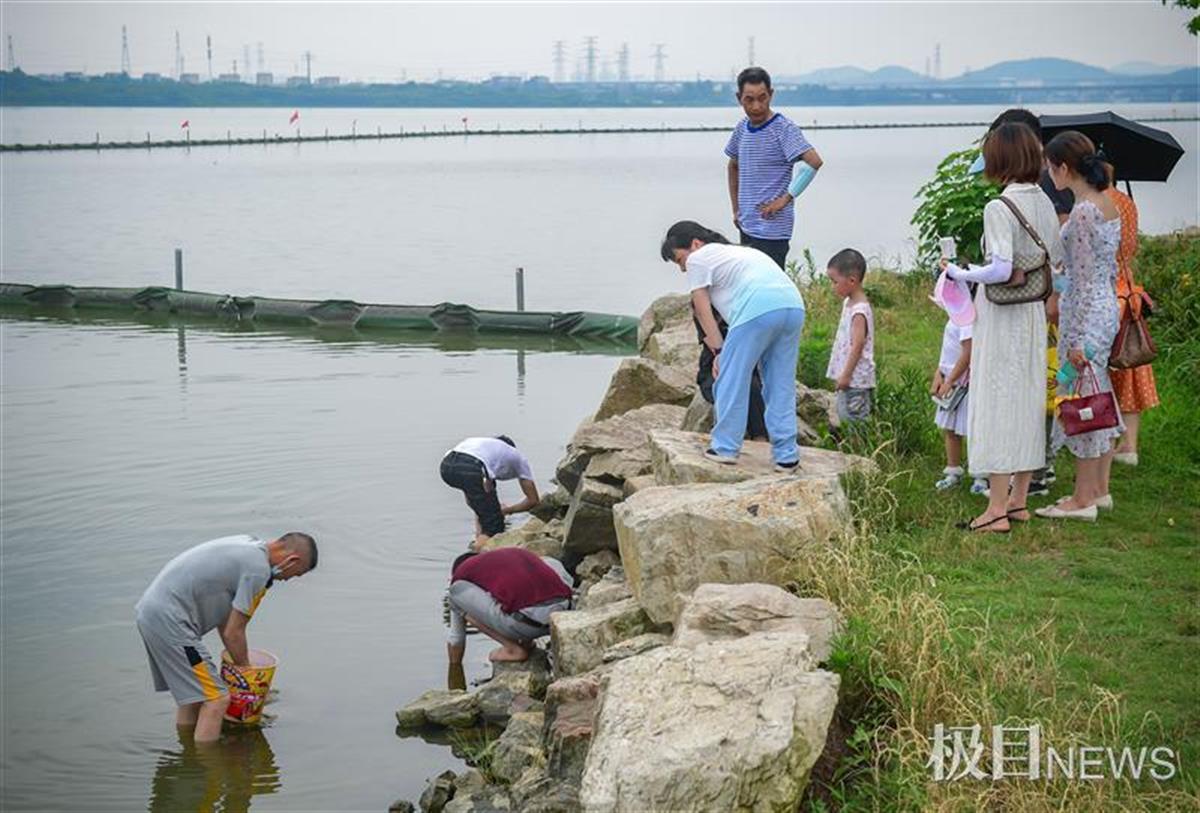 ”我又捡了一把,这里好多田螺,还有小龙虾……”,捡田螺的小伙子对记者说。我们看到这里湖水很浅,石块比较平整,靠湖边的湖水清澈,水草丛生,目测就能看到石缝里有许多田螺,所以就下水捡了起来,主要是好玩。
