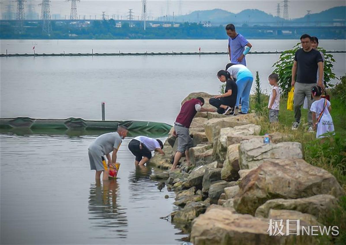 6月26日中午,武汉马鞍山森林公园靠东湖边,3位小伙在湖边的水中捡田螺,一个小时捡了半桶,看到好玩,两名小姑娘在家长的看护下,卷起裤脚,也下水捡起田螺来。