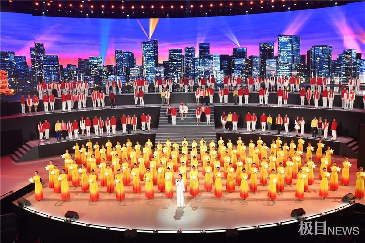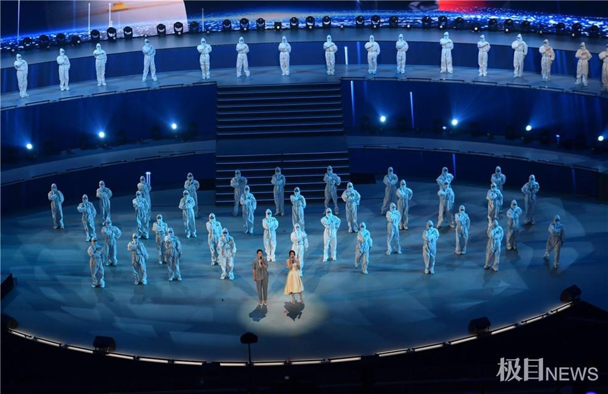 接下来,童声唱响《我的祖国》,展现湖北人民不畏艰难、顽强不屈,凝聚万众一心、抗击疫情的强大力量。最后,舞台上所有市民和歌手共同唱响《天耀中华》的高昂旋律。
