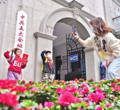 孩子们在家长的带领下参观中共五大会址纪念馆,接受爱国主义教育。