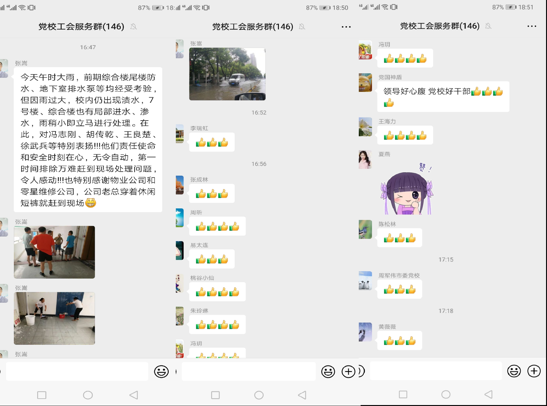 起因源自该校副校长张嵩在群里发的一条信息“今天午时大雨,前期综合楼尾楼防水、地下室排水泵等均经受考验,但因雨势过大,校内仍出现渍水,7号楼、综合楼也有局部进水、渗水,雨势稍小即立马进行处理。在此,对冯志刚、胡传乾、王良楚、徐武兵等特别表扬!!!他们责任使命和安全意识时刻在心,无令自动,第一时间排除万难赶到现场处理问题,令人感动!!!也特别感谢物业公司和零星维修公司,公司老总穿着休闲短裤就赶到现场”。