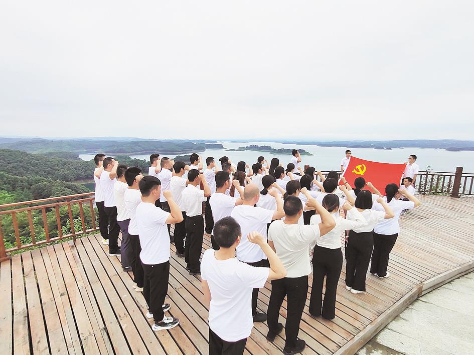 6月27日,丹江口市在牛河林区五谷庙村千岛画廊景区,举办“共抓大保护、当好守井人”党建示范区新发展党员集中宣誓活动。