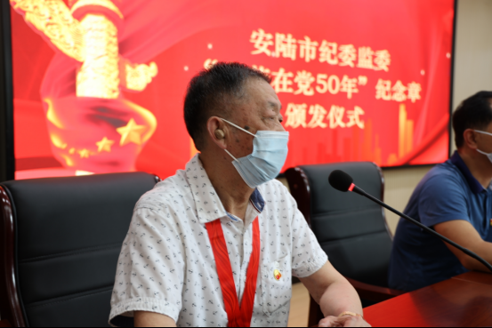 “在党五十年,党恩记心田,永远跟党走,夕阳红遍天……”6月25日晚,安陆市纪委监委机关举行“光荣在党50年”纪念章颁发仪式、党员集体过政治生日及“书记讲党课”三项活动。退休老党员宋庆直戴上“光荣在党50年”纪念章,并讲述了自己的故事。