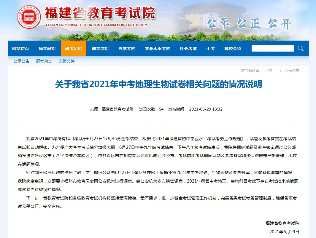 针对部分网民反映的福州“爱上学”微信公众号6月27日18时2分在网上传播福建省2021年中考地理、生物试题及参考答案,试题疑似泄露的情况,福建省教育考试院高度重视,立即要求福州市教育局会同公安机关进行调查。经公安机关多方缜密调查,2021年福建省中考地理、生物科目考试不存在考试结束前泄题或试卷内容被窃的情况。